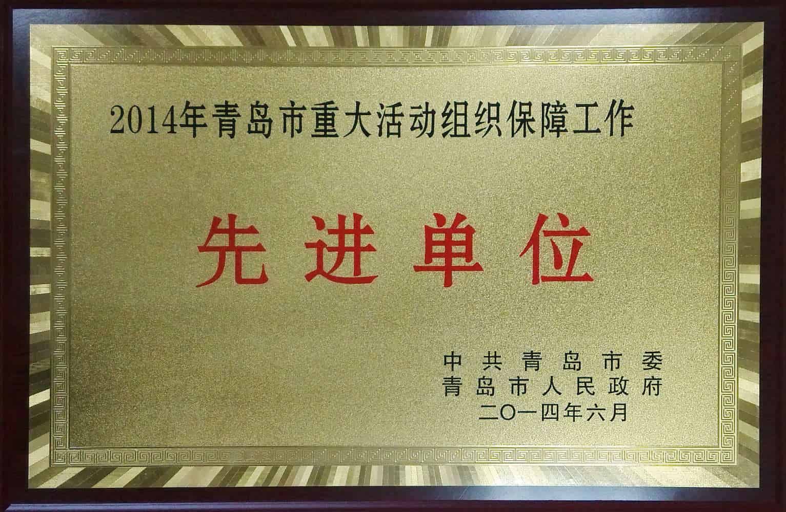 2014年6月榮獲2014年青島市重大活動組織保障工作先進單位