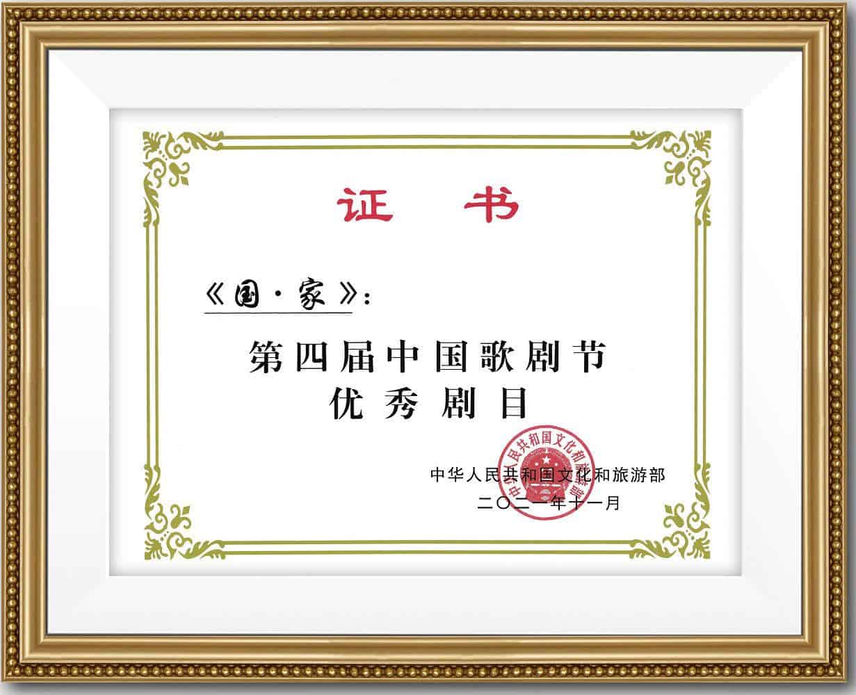 2021年民族歌劇《國(guó)·家》榮獲第四屆中國(guó)歌劇節(jié)優(yōu)秀劇目(獎(jiǎng)狀)
